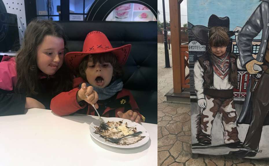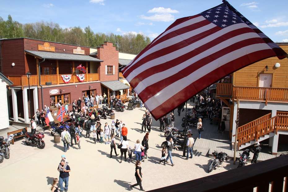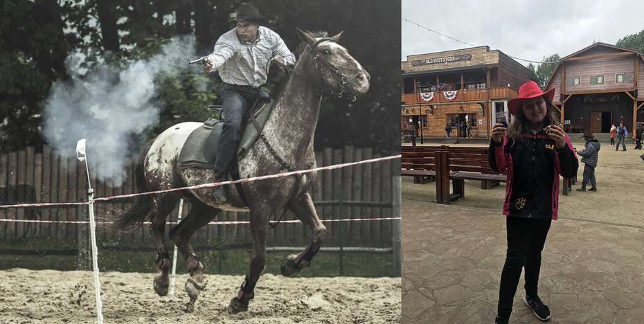 Ocitáme sa na divokom západe začiatkom 19.storočia. Okolo mňa prechádzajú dvaja statní kovboji vo vysokých čižmách, zbrane za opaskom. Podvedome ihneď beriem najmladšiu ratolesť za ruku. Pred nami je postavené naozajstné americké westernové mesto. Z terás vejú americké zástavy, sú tu dobové obchodíky aj reštaurácie. Ale niečo tomu akosi chýba... Nie mestečku, ale nám! Aby sme zapadli a neboli moc nápadní, vchádzame do prvého obchodíka a kupujeme kovbojské klobúky! Vyťahujem zlote a na cene sa len milo usmievam - tu dnes moja peňaženka určite neutrpí :)
