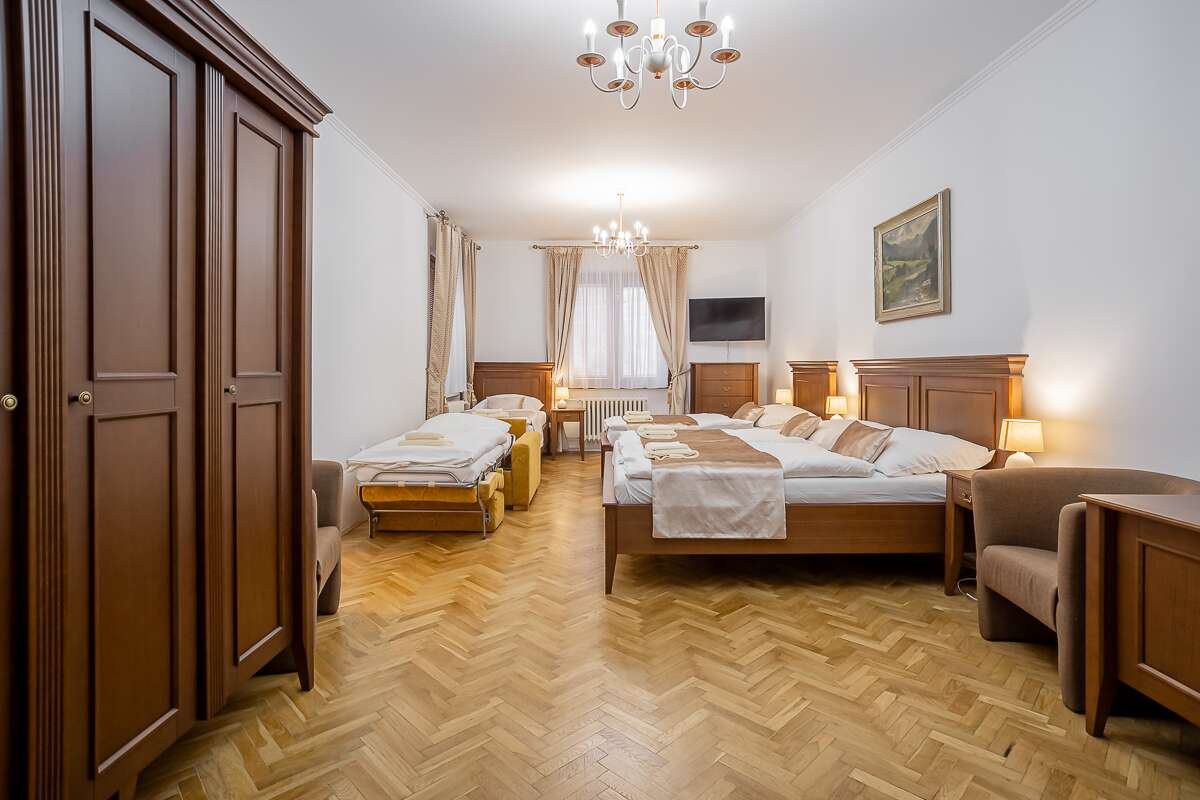 Pre rodiny sú k dispozícii krásne rodinné apartmány, kde je možné komfortne ubytovať 4 až 5 hostí.  Apartmám tvorí spálňa s manželskou posteľou a prístelkou, izba s dvoma oddelenými lôžkami, obývačka s jedálnym stolom a kuchynka.